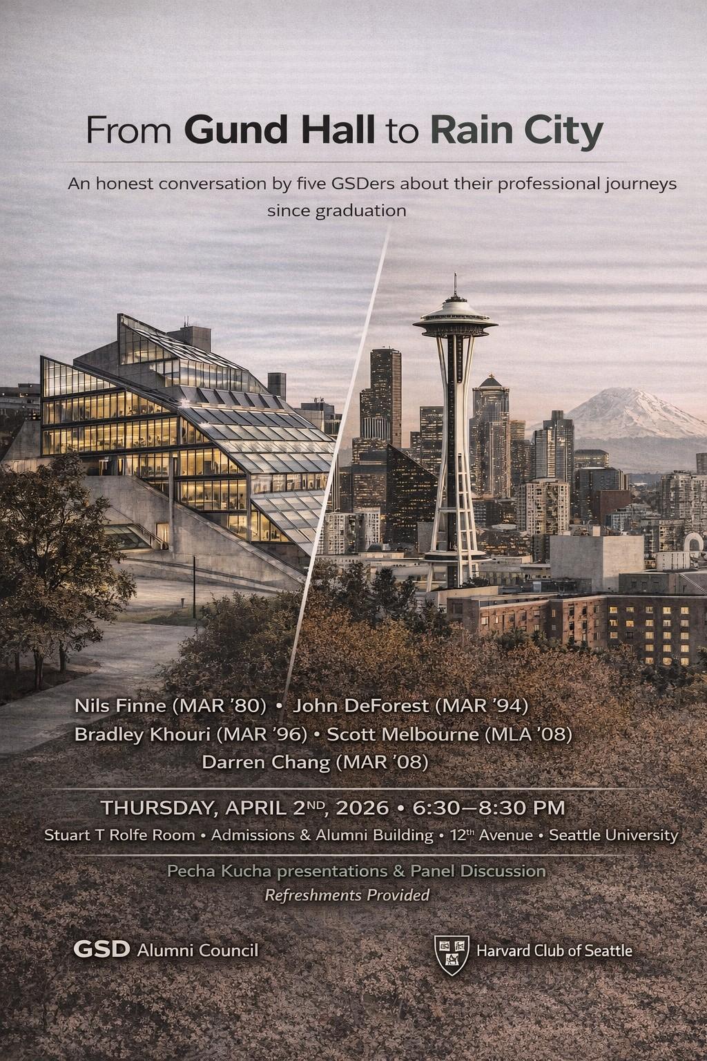 Please join us for an open and honest conversation with five members of our Harvard Graduate School of Design (GSD) alumni community as they reflect on their experiences since leaving Gund Hall. Hosted by GSD and HCS. -